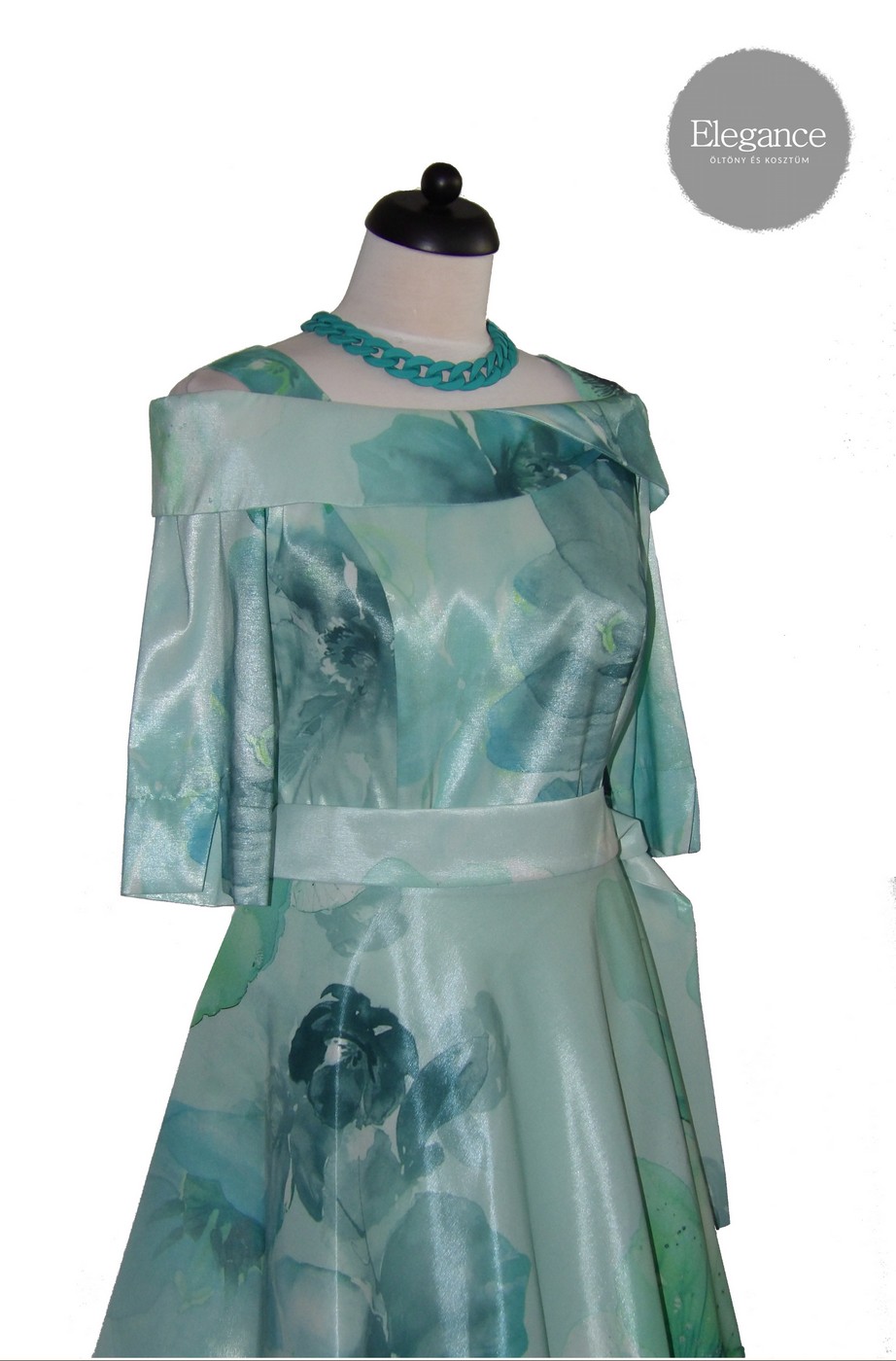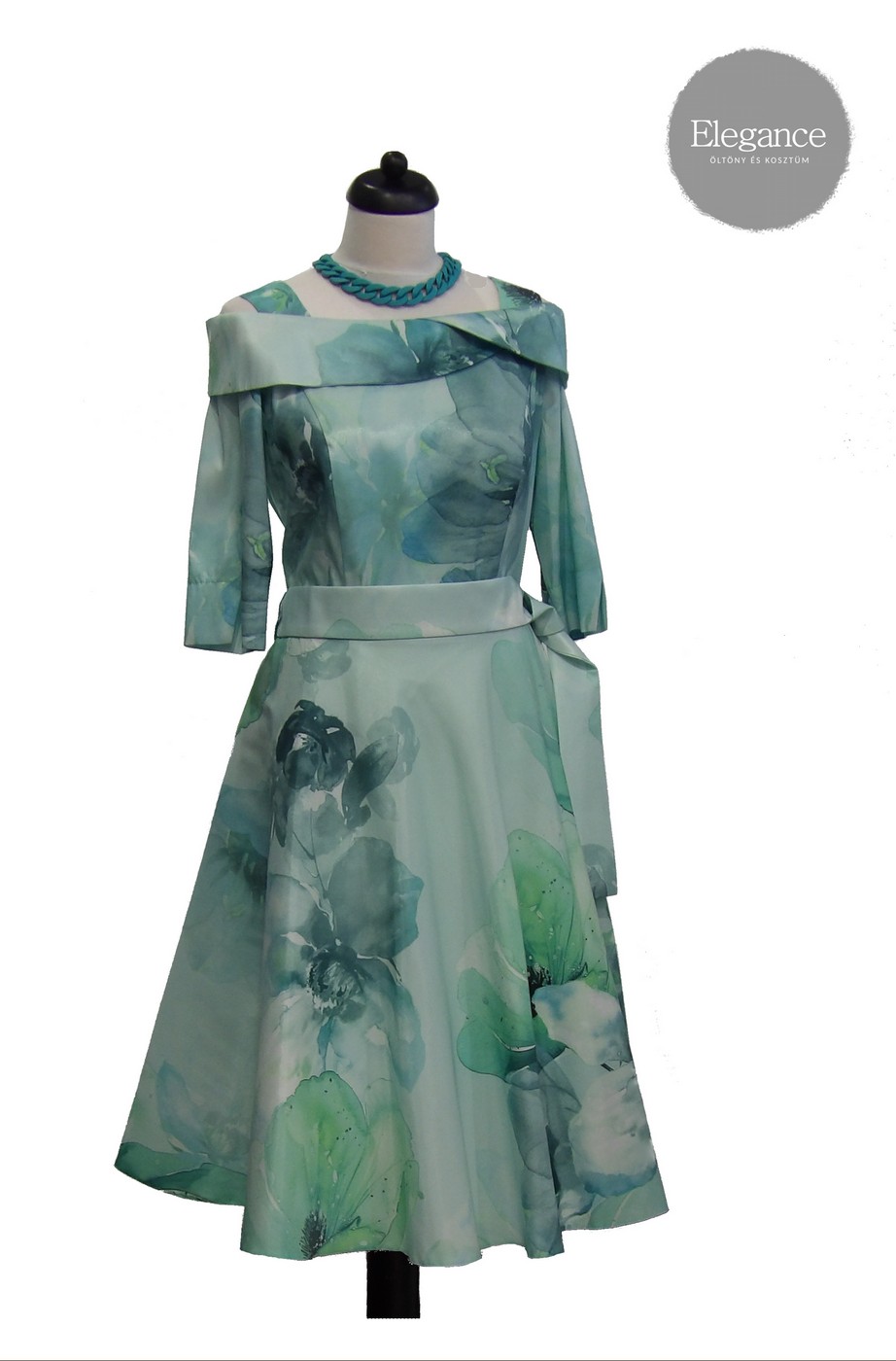 A zöld árnyalataiban játszó A vonalú riha, rejtett zsebbel, övvel, csónakkivágással, vállpánttal