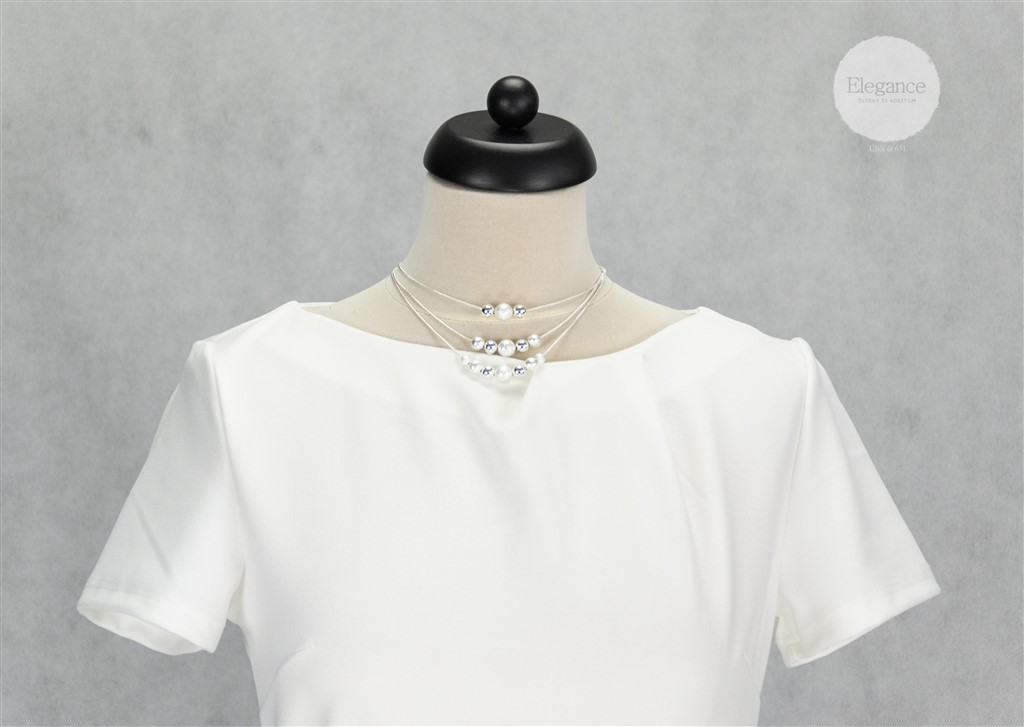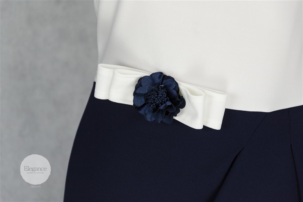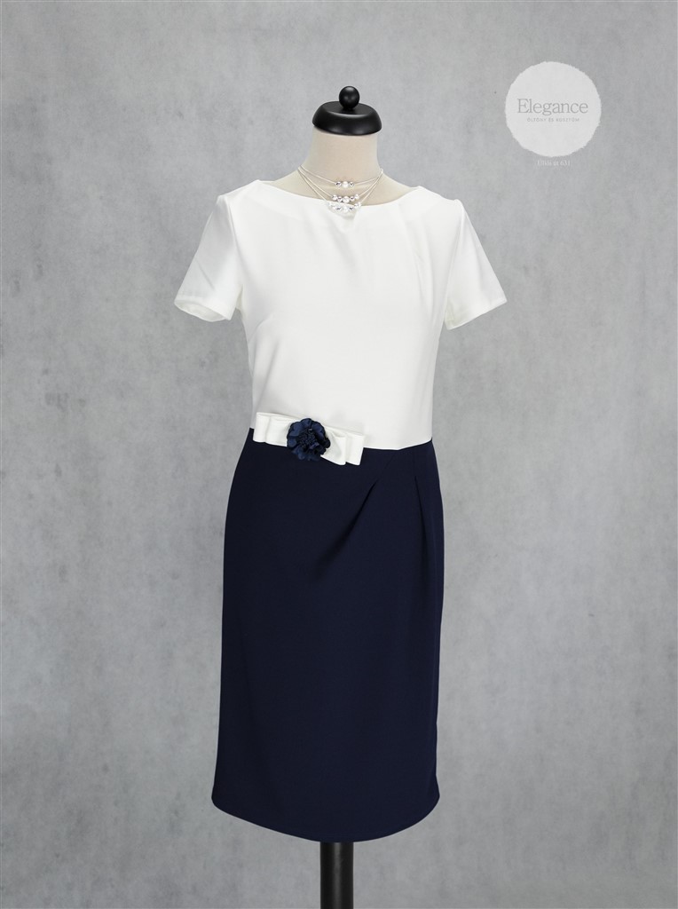 Sötétkék-fehér, derékban szabott, klasszikus, elegáns ruha.