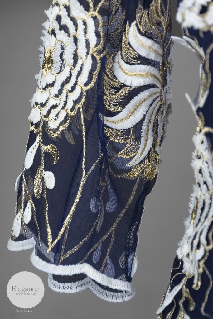 Sötét kék alkalmi ruha csipke ujjal, csipke rátéttel.