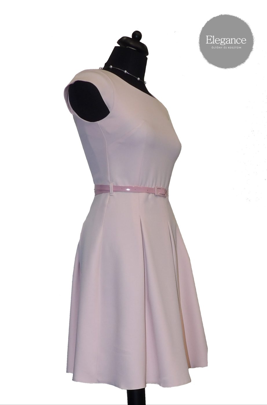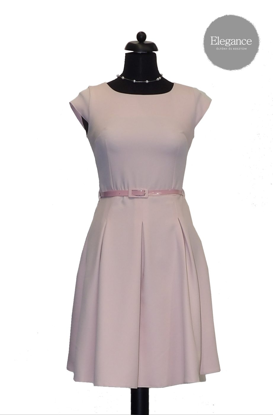 Púder azínű, A-vonalú, kicsit térd fölé érő ruha, övvel.