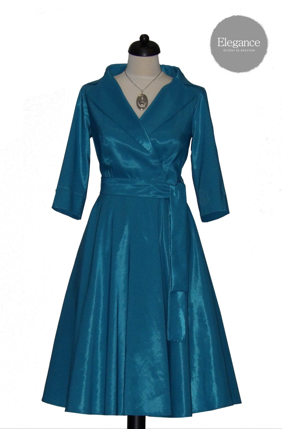 Türkiz színű taft ruha.Könyékig érő ujj, rejtett zseb és öv.