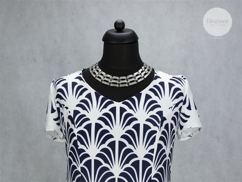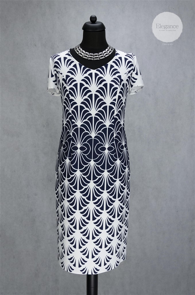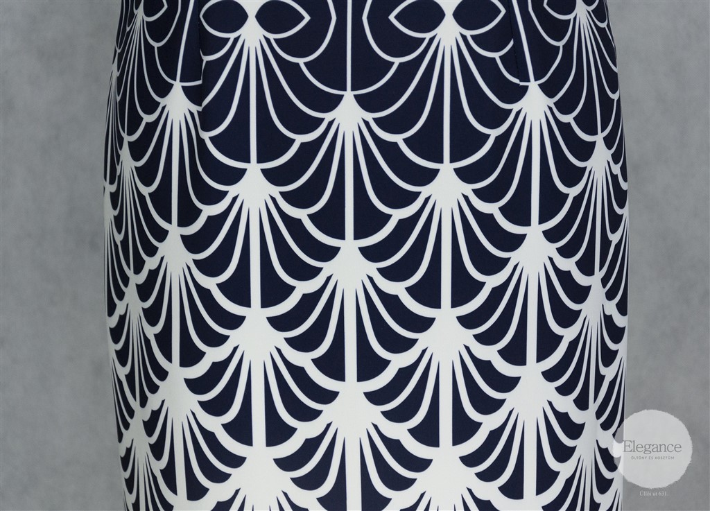 Rövid ujjas, sötétkék-fehér mintás alkalmi ruha. Sötétkék, vagy fehér kis blézerrel nagyon mutatós tud lenni!