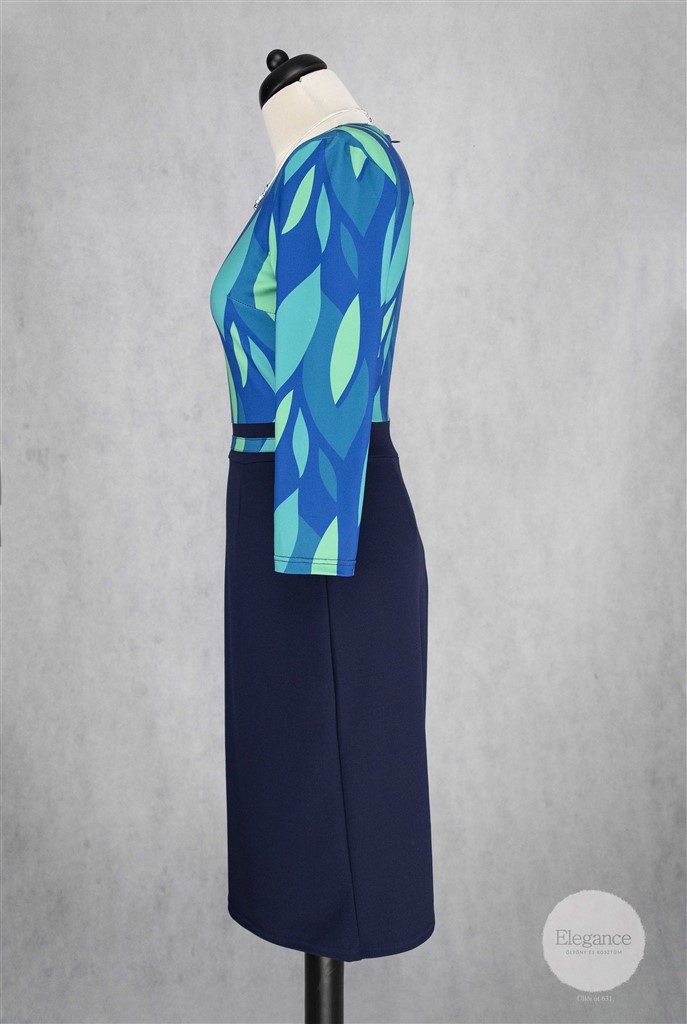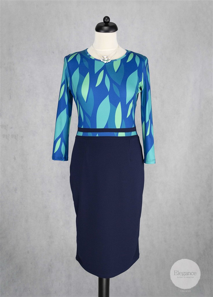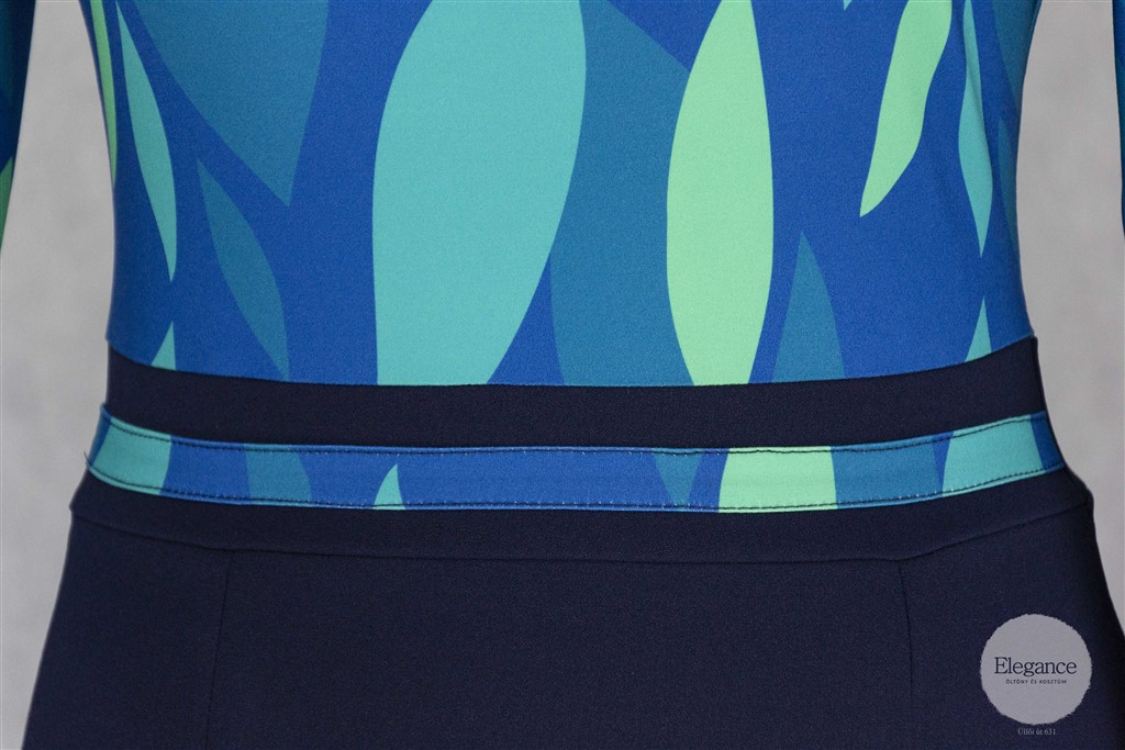 Egyenes vonalú, derékban szabott, sötétkék aljú ruha.