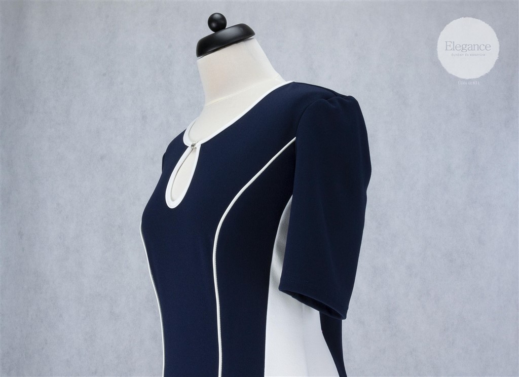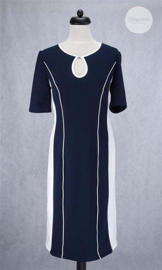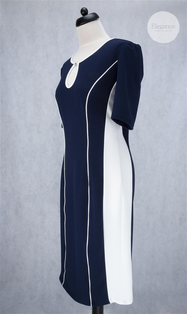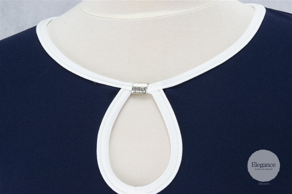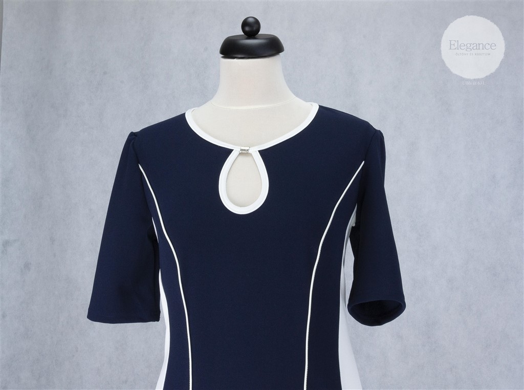 Rövid ujjú, sötétkék-fehér díszítésű alkalmi ruha.