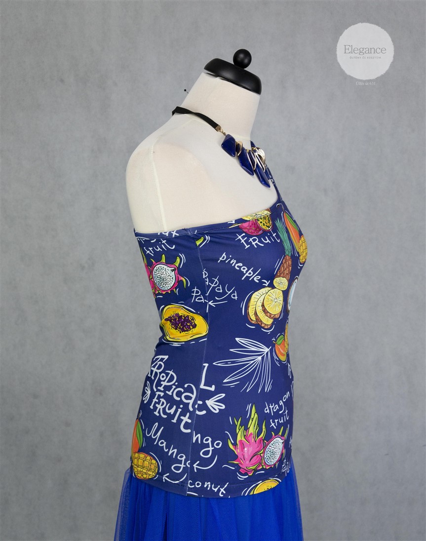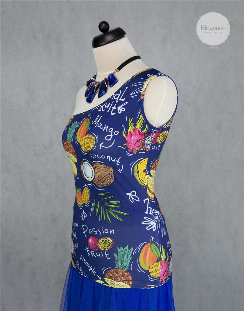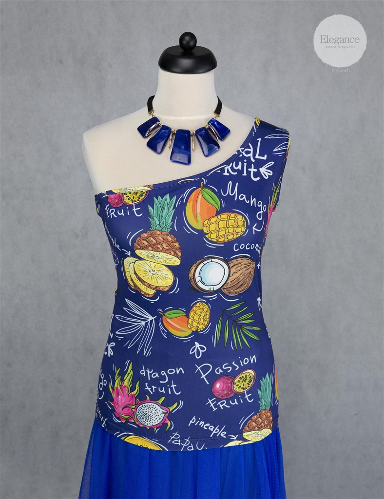 Sötétkék alapon gyümölcsmintás, asszimetrikus, elasztikus anyagból készült nyári felső.