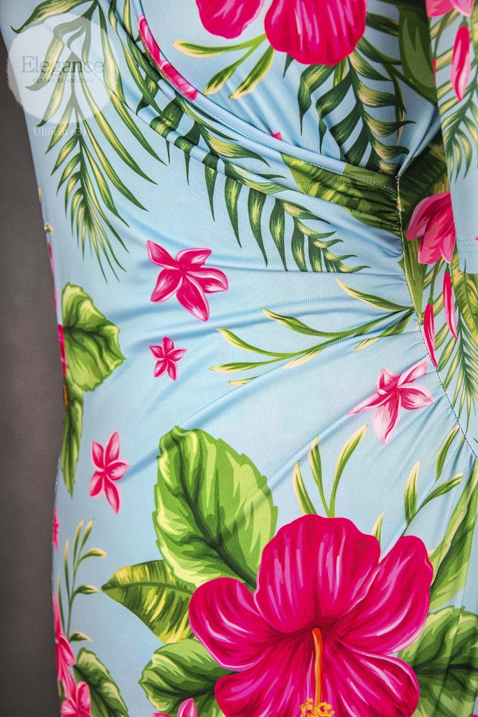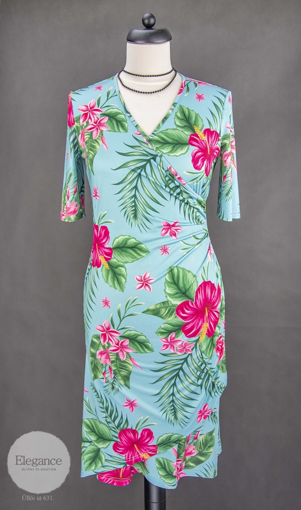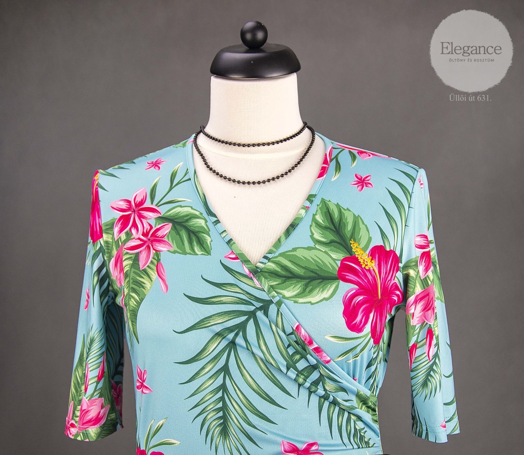 Türkiz alapon virág mintás, átlapolt, nyári ruha.