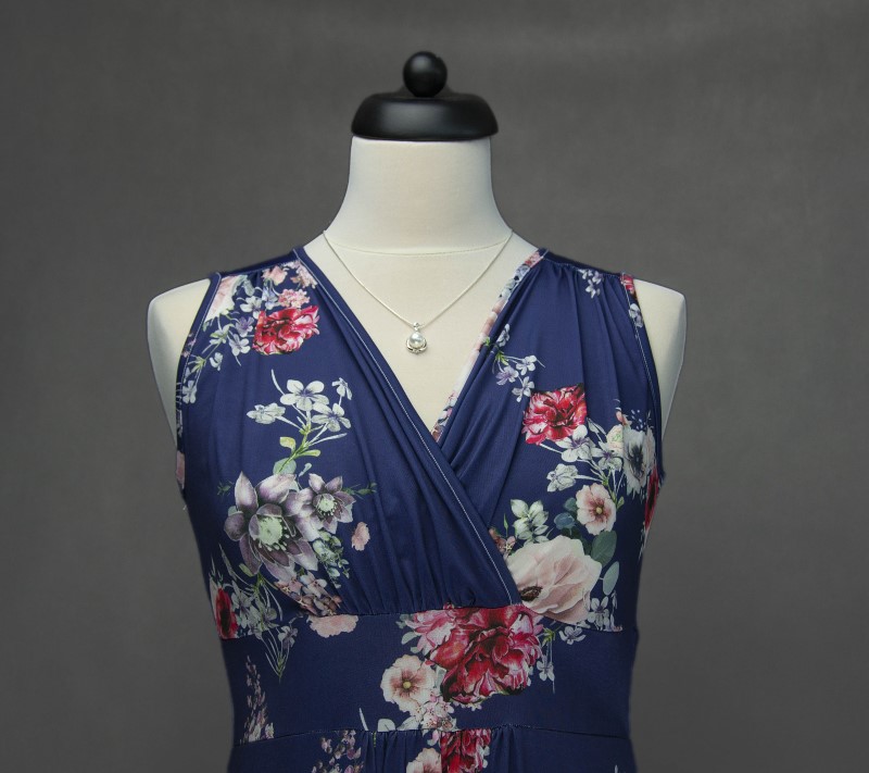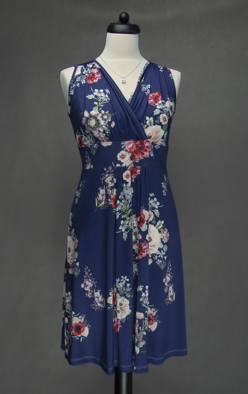 Sötétkék alapon, virágmintás, ujjatlan. átlapolt nyári ruha.
