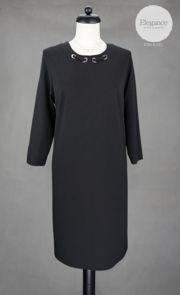 Fekete 3/4-es ujjú ruha, nyakánál díszítéssel.