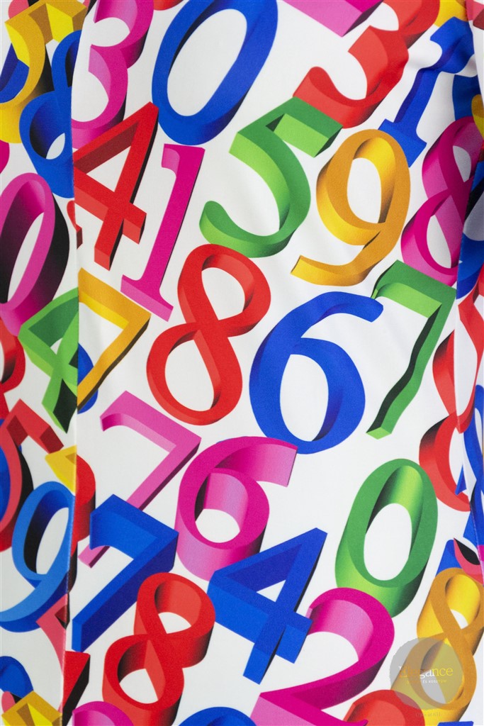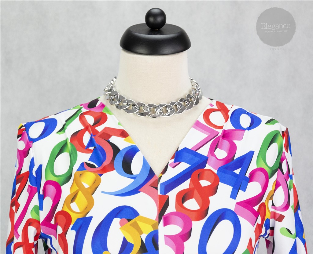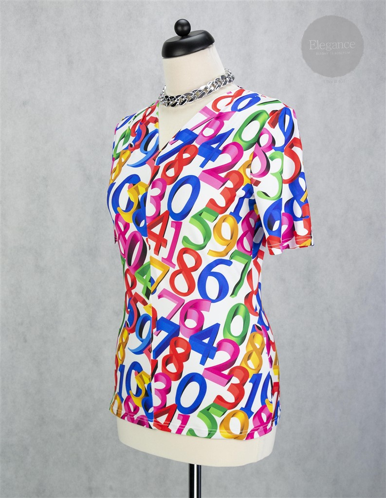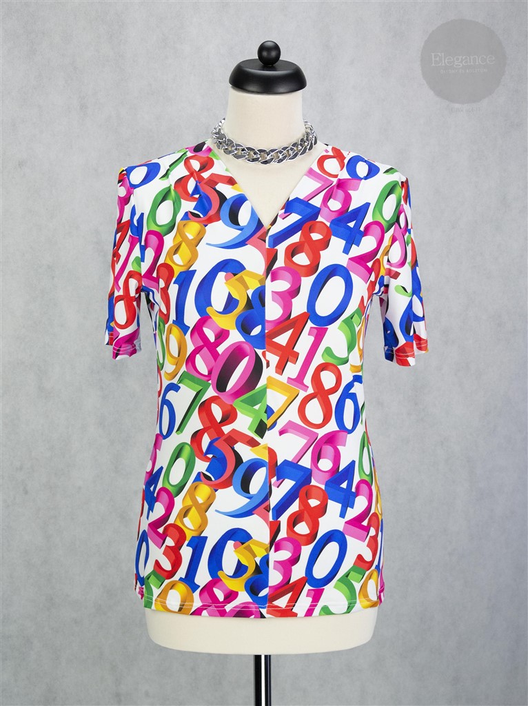 Rövidujjú, fehér alapon szines számokkal mintázott V nyakú felső