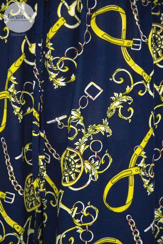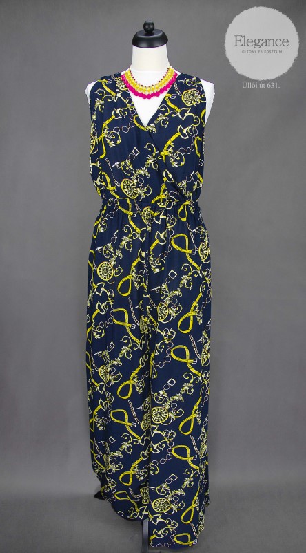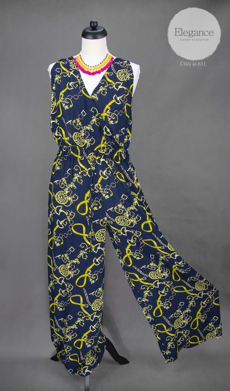 Ujjatlan,sötét kék, sárga mintás, átlapolt, nyári overall.
