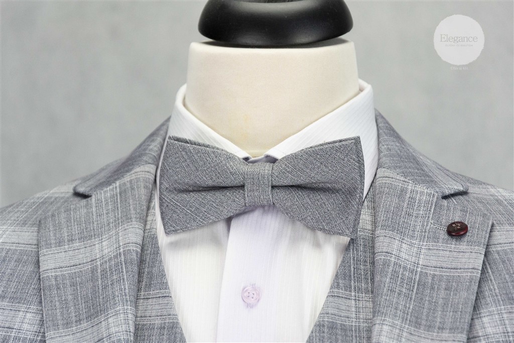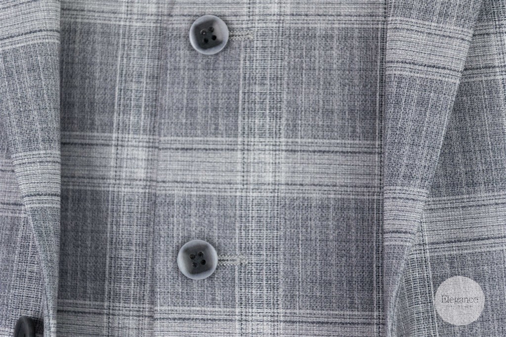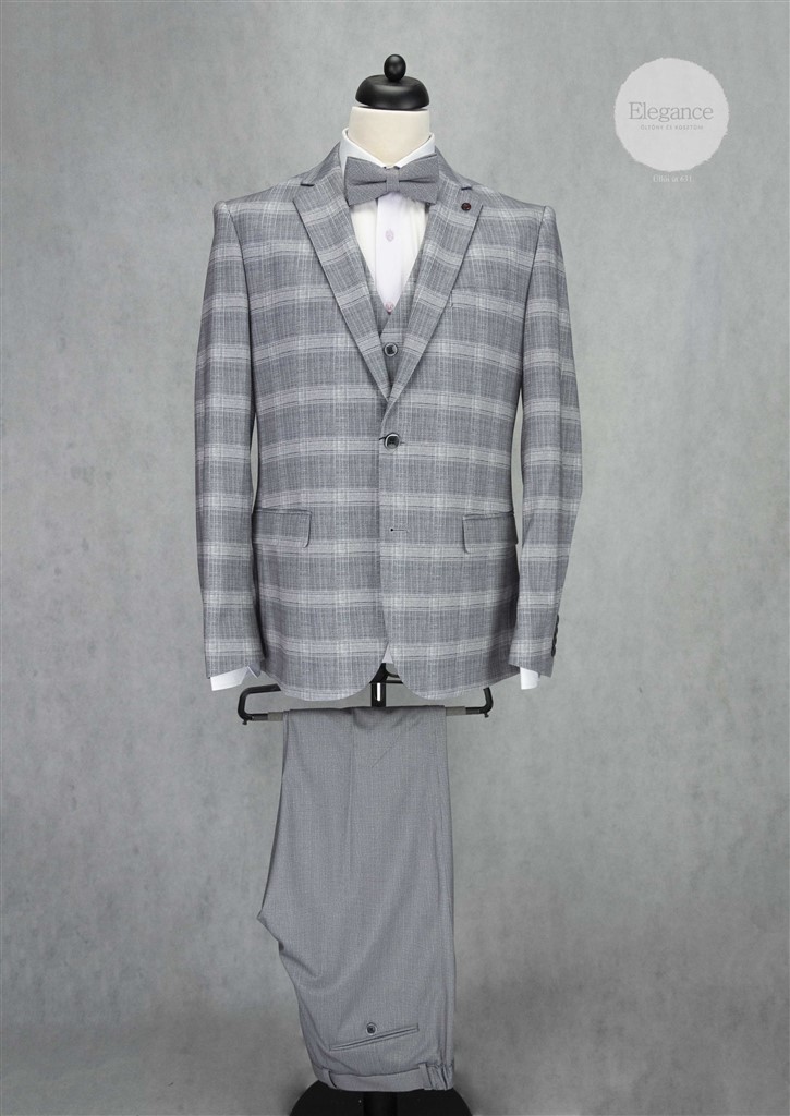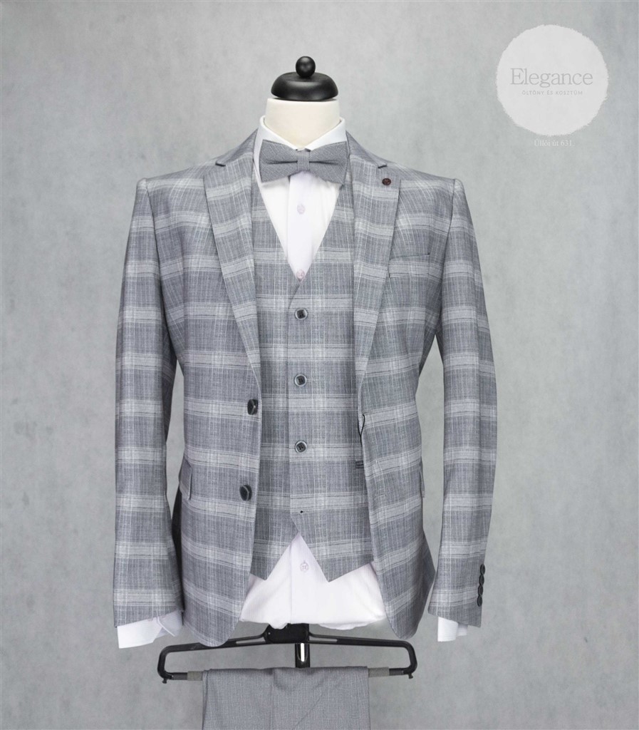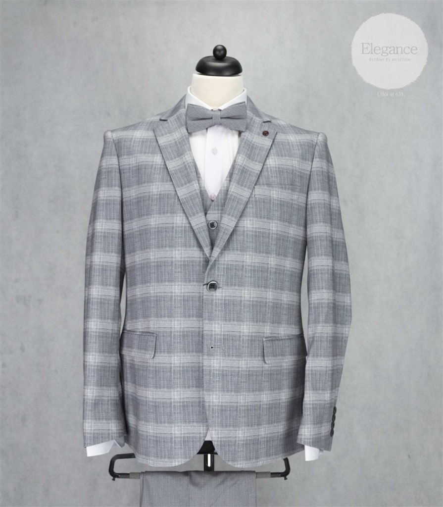 Szürke kockás vőlegényöltöny mellénnyel és csokornyakkendővel