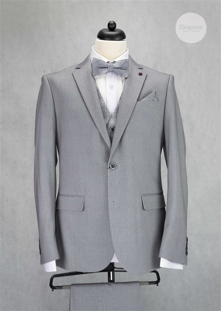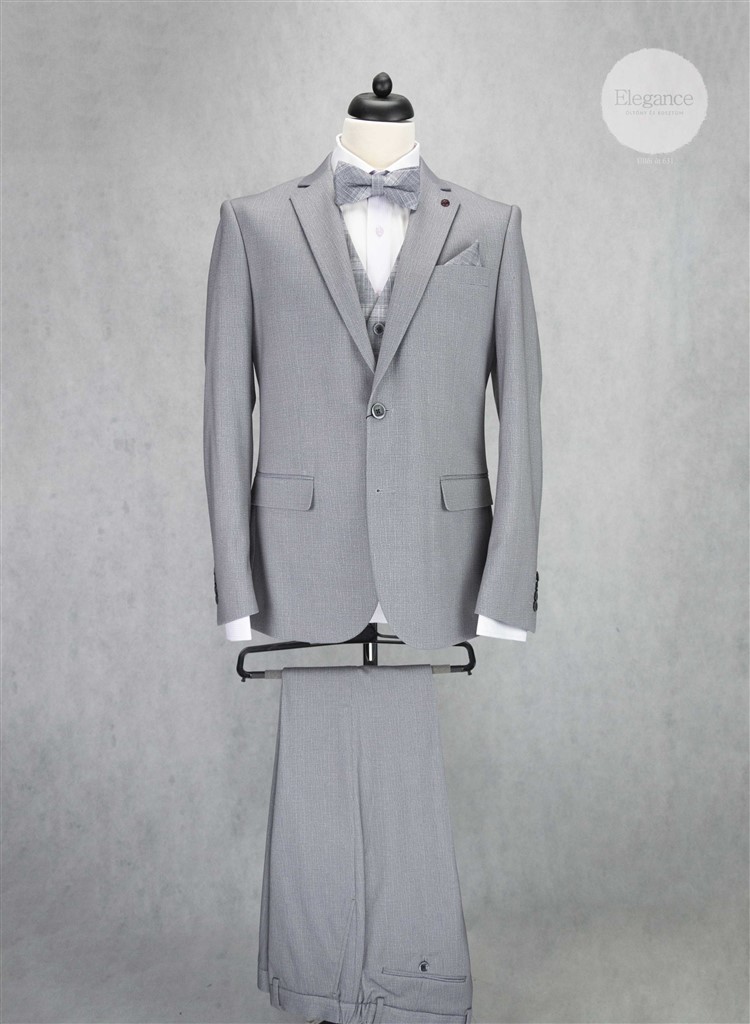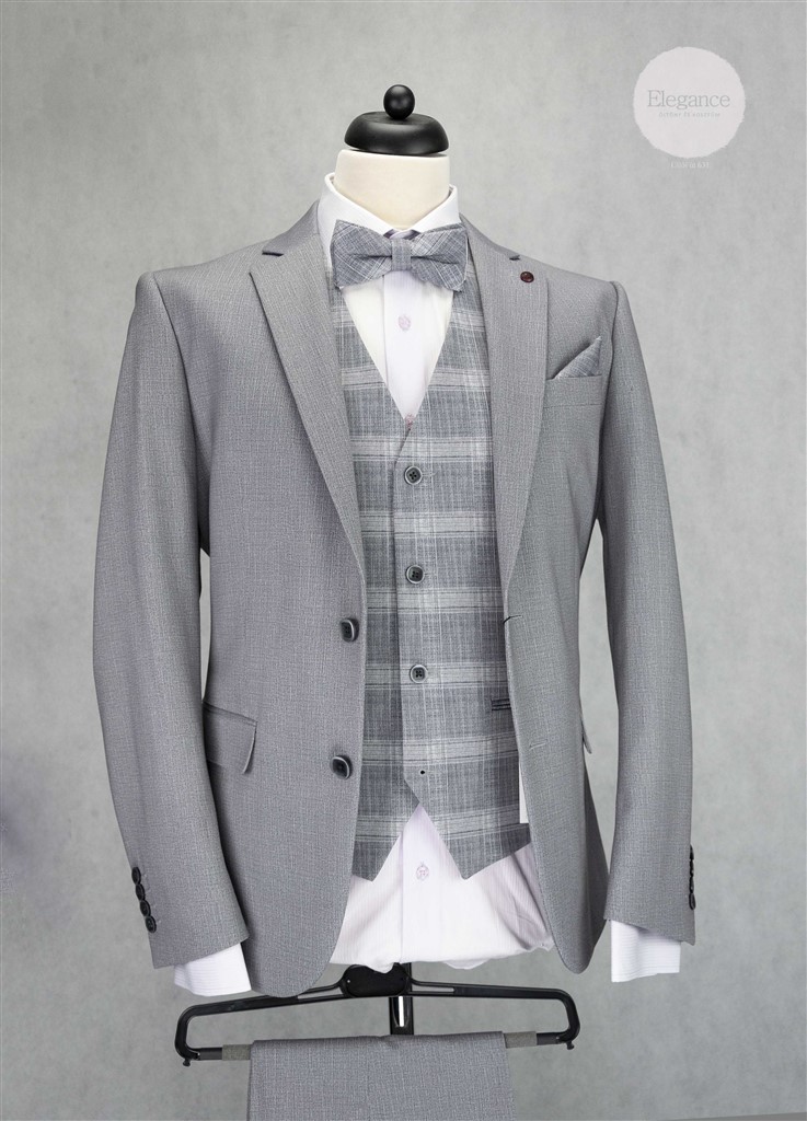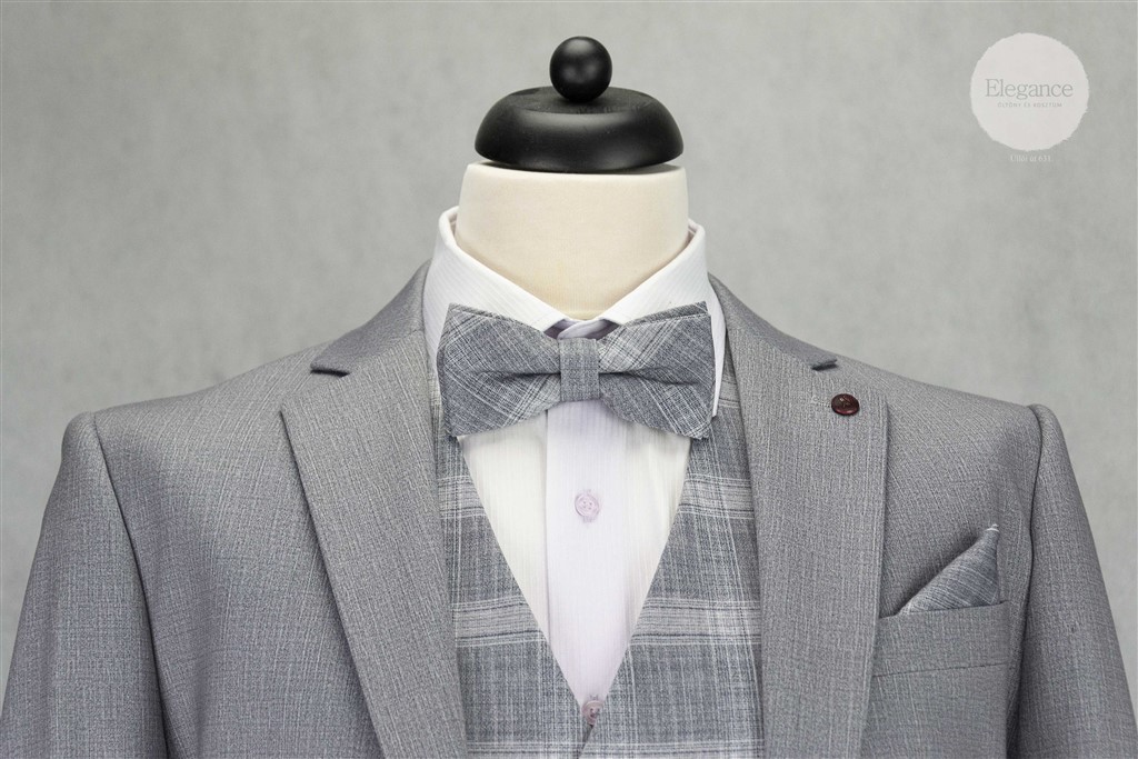 Világos színű vőlegényöltöny mellénnyel és csokornyakkendővel