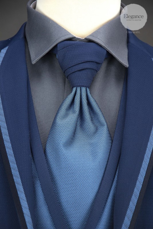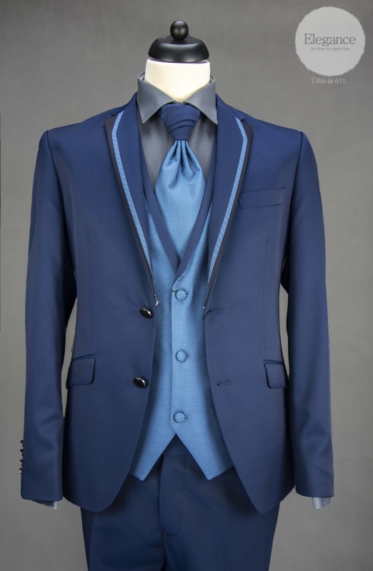 65% gyapjú 35% viszkóz tartalmú vőlegény öltöny, mellénnyel és nyakkendővel.